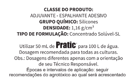 PRATIC é um adjuvante derivado de silicones que traz em sua formulação antiespumantes, surfactantes e umectantes, adicionando calda de fungicidas, herbicidas, inseticidas e demais aplicações agrícolas, que requerem o uso de produtos com essa finalidade resultando em melhor absorção e penetração pelas folhas e fruto.